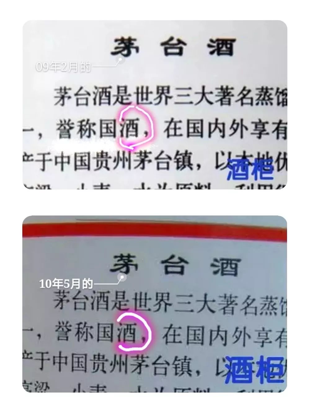 背标主要记住一个字——酒,09年上半年前,背标第二行“誉称国酒”的酒字中间一横笔画两头到头,无空隙。约下半年以后,中间一横不到头,两头有空隙。