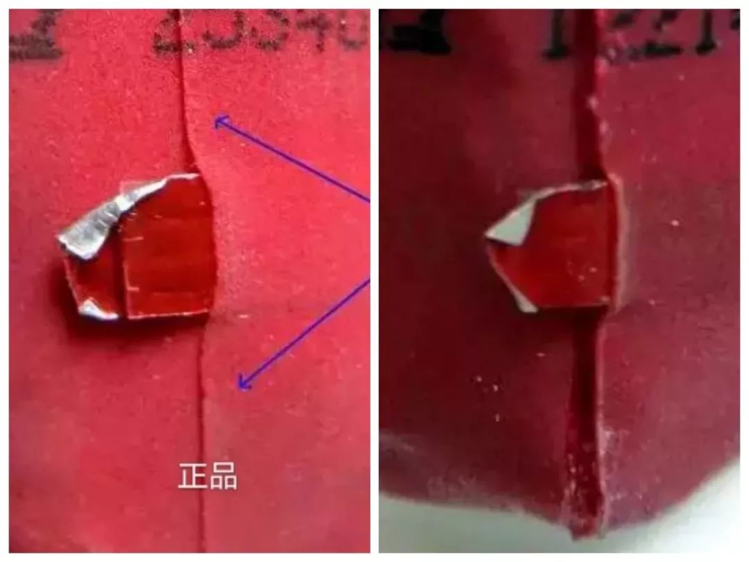 正品布套的粘合拉口处比较规整、平直服帖;拉开环纸的上下各有一个切口。仿品的较粗糙,不平贴,不规整。